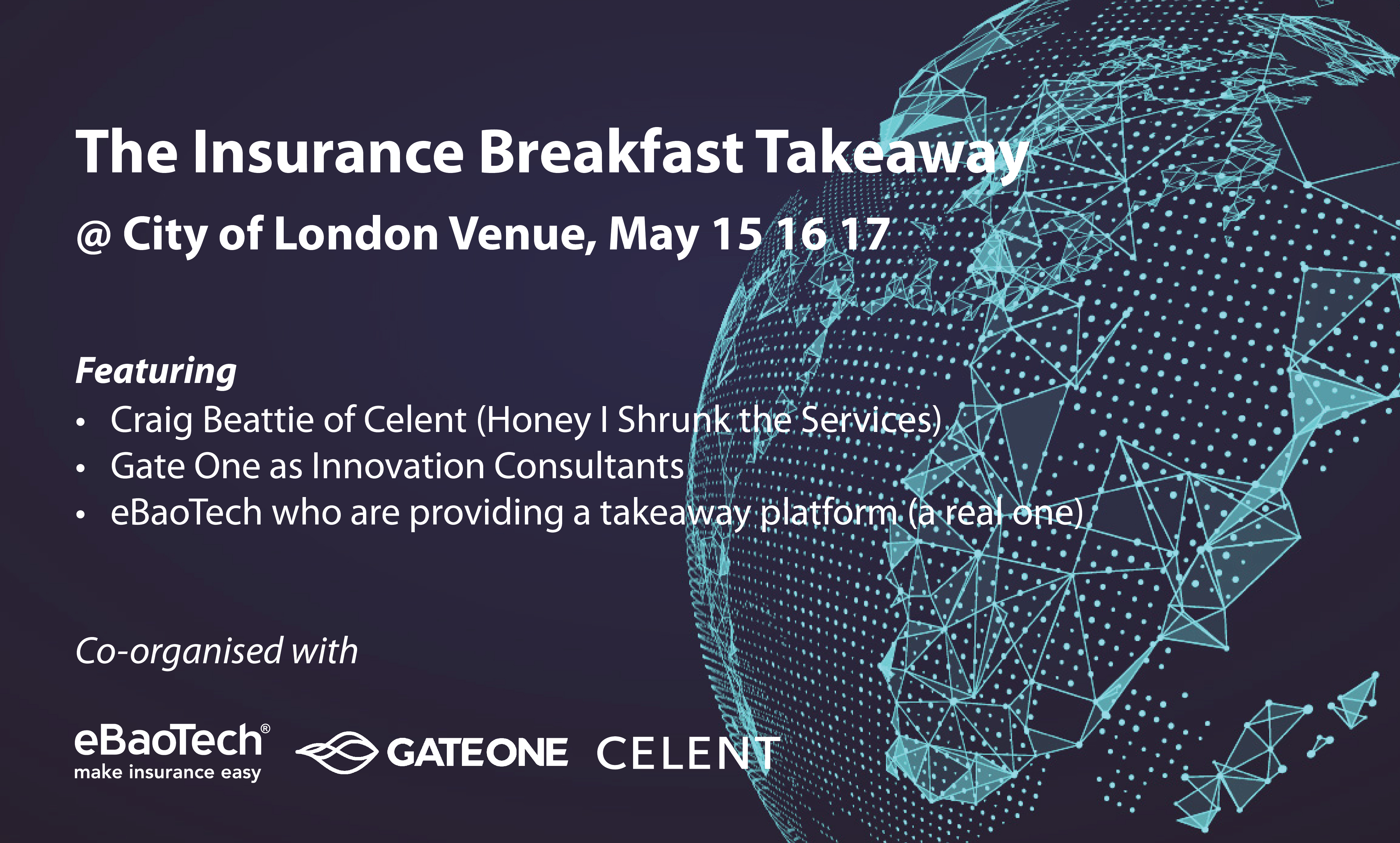 eBaoTech, Gate One and Celent will co-organize three breakfast meetings from May 15-17 at a City of London venue. The Insurance Breakfast Takeaway event features: